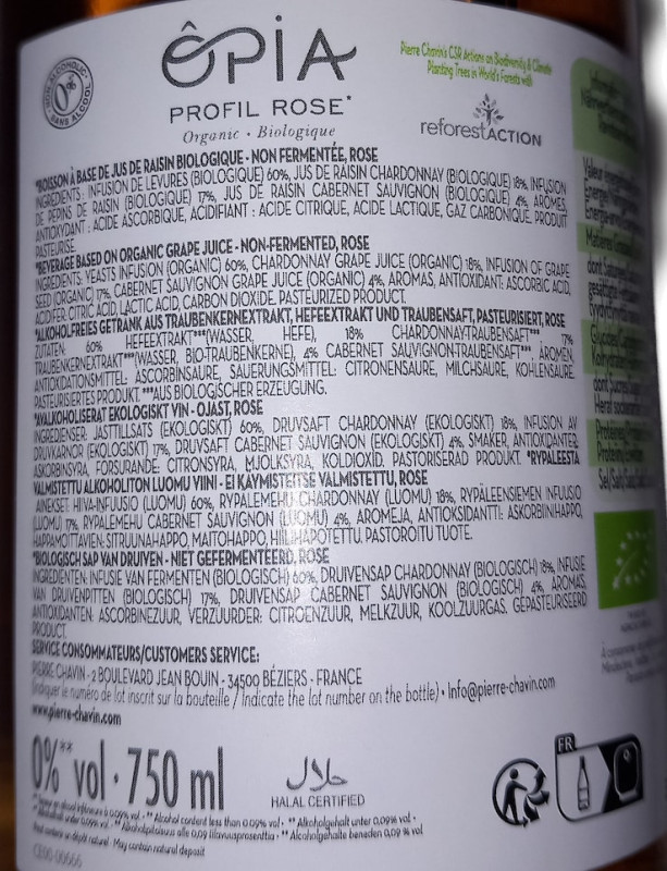 60% Hefeextrakt*** (Wasser, Hefe), 18% Chardonnay-Traubensaft***, 17% Traubenkernextrakt*** (Wasser, Bio-Traubenkerne) 69%, Traubensaft aus Cabernet-Sauvignon Trauben*** 4%, Aromen, Antioxidationsmittel: Ascorbinsäure ( Vitamin C ), Säuerungsmittel: Citronensäure, Milchsäure, Kohlensäure. Pasteurisiertes Produkt. *** aus kontrolliert biologischem Anbau.